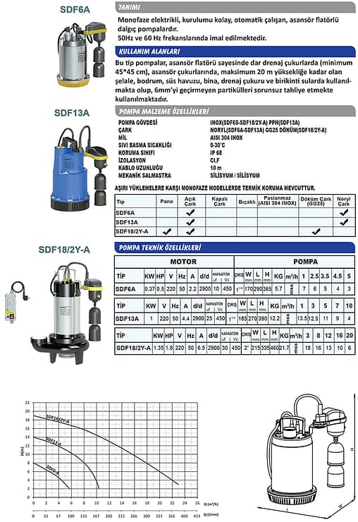 Pompa çalışma sahasının dar olduğu yerlerde sıvı seviye flatörlerin de yaşanan sorunları minimuma indirmek için tasarlanan Asansör Flatörlü ürünlerimiz Paslanmaz Gövdeli Drenaj Dalgıç Pompalar SDF6A, Drenaj Dalgıç Pompalar SDF13, Az Kirli Su Dalgıç Pompalar SDF18/2Y-A, Foseptik Dalgıç Pompalar SDF14/2-A SDF18/2-A, SBRM18/2P-A modelleri ile tasarlanmıştır.