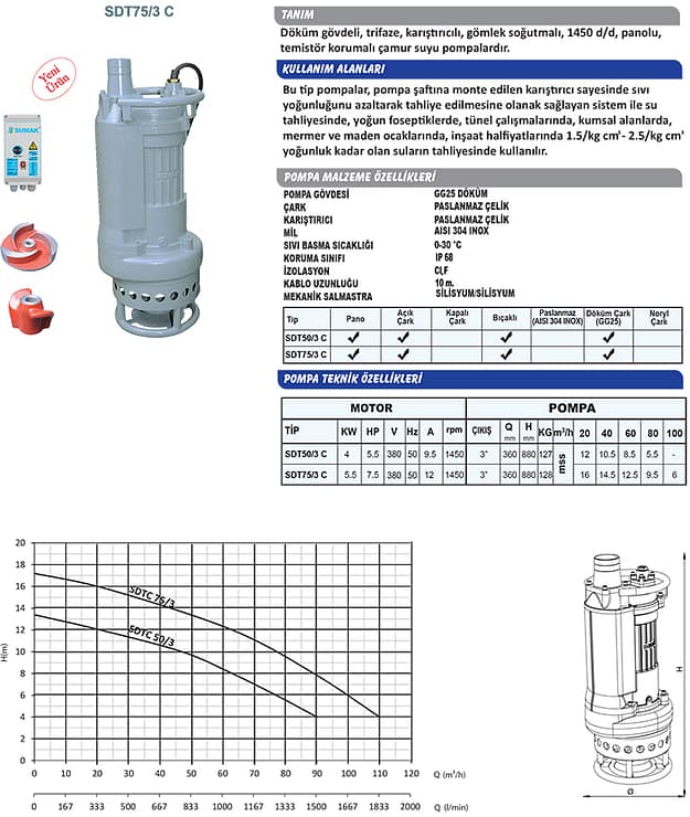 1450 d/d 5.5 ve 7.5 Hp 3” çıkışlı max 18 m yüksekliğe ve 1.2 kg/cm ile 2.5 kg/cm3 arası yoğunluğa kadar olan sıvıların tahliyesi için son derece ideal pompalardır. Pompa şaftına monte edilen karıştırıcı sayesinde sıvı yoğunluğunu azaltarak tahliye edilmesine olanak sağlayan sistem sayesinde, inşaat, birikinti su tahliyesinde, yoğun olan fosseptiklerde, tünel çalışmalarında, baraj çalışmalarında, kumsal alanlarda daha ekonomik çözüm sunmaktadır.
