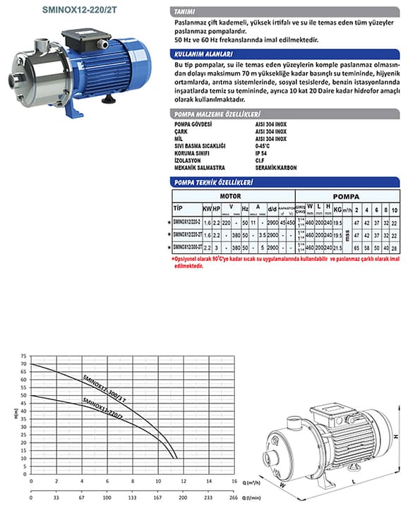 Komple paslanmaz çok kademeli pompalarımız maksimum 70 metre yüksekliğe kadar basınçlı su ihtiyaçlarında, hijyenik ortamlarda, arıtma sistemlerinde, tarımsal sulamalarda, benzin istasyonlarında, sosyal tesislerde binalarda hidrofor amaçlı, ve inşaatlarda temiz su temininde kullanıma uygun olarak üretilmiştir. Tasarlanan yeni ürünlerimiz opsiyon el olarak 120°C’ye kadar sıcak su uygulamalarında kullanıma uygundur.